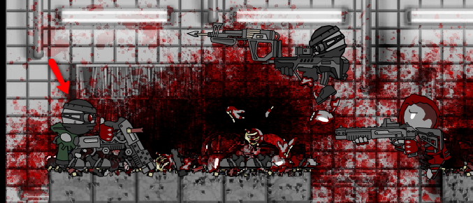 Et oui c'est moi au-dessous de la flèche avec un duel de shotguns dans les doigts!! Bon au premiers abords ce screenshot de Thing Thing 3 paraît assez... glauque (en plus y a même des morceaux de chair et des os qui volent si vous regardez bien). Mais finalement c'est assez fun et un excellent défouloir. Bon je vais vous expliquer le principe. Comme vous avez pu le constater, Thing Thing Arena 3 est un jeu d'action trépidant dans le but est massacrer le plus d'ennemis. En bref, ce que je veux vous dire, c'est que vous vous glissez dans la peau d'un psychopathe meurtrier à la Rambo. Et vous avez le choix de mettre le sang... ou pas. Mais c'est moins drôle.